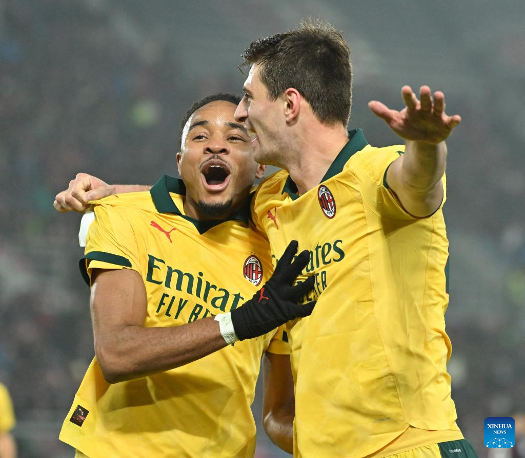 AC Milan's Christopher Nkunku (C) celebrates his goal with his teammate Matteo Gabbia (R) during a Serie A football match between Bologna and AC Milan in Bologna, Italy, Feb. 3, 2026. (Photo by Alberto Lingria/Xinhua)