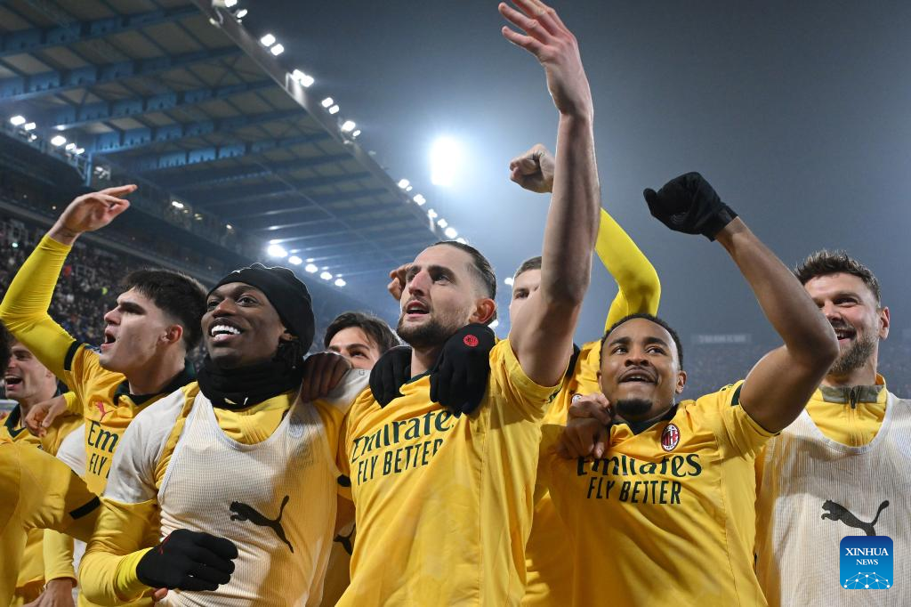 AC Milan's Adrien Rabiot (C) celebrates his goal with his teammates during a Serie A football match between Bologna and AC Milan in Bologna, Italy, Feb. 3, 2026. (Photo by Alberto Lingria/Xinhua)