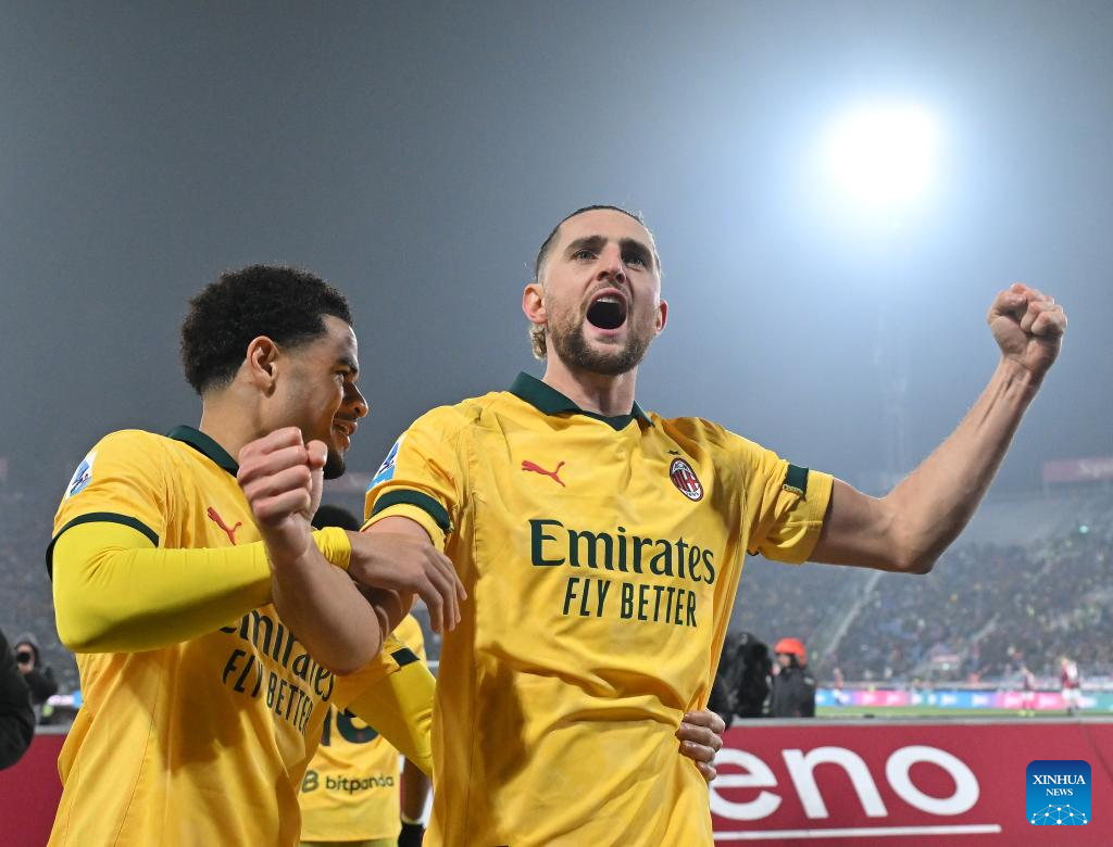 AC Milan's Adrien Rabiot (L) scores during a Serie A football match between Bologna and AC Milan in Bologna, Italy, Feb. 3, 2026. (Photo by Alberto Lingria/Xinhua)