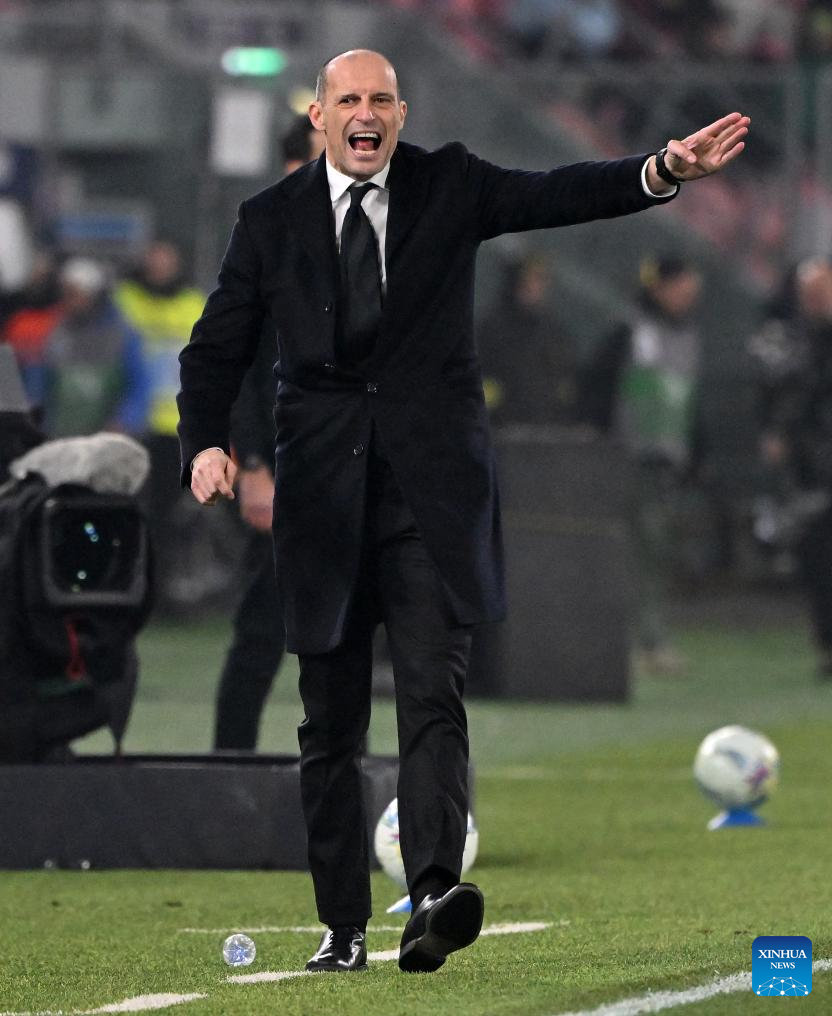 AC Milan's head coach Massimilianmo Allegri gestures during a Serie A football match between Bologna and AC Milan in Bologna, Italy, Feb. 3, 2026. (Photo by Alberto Lingria/Xinhua)