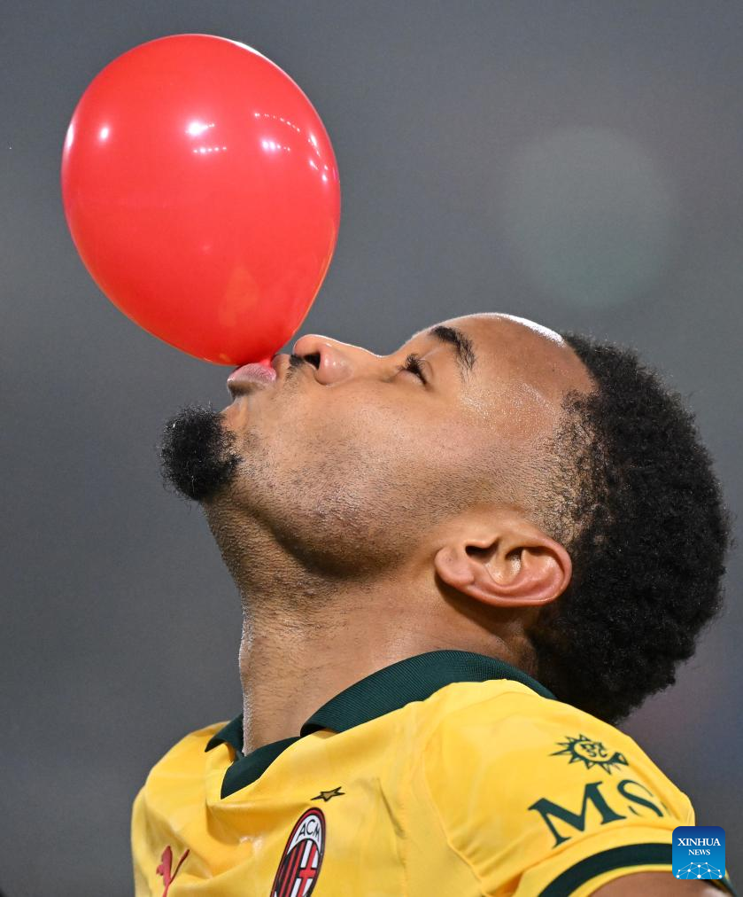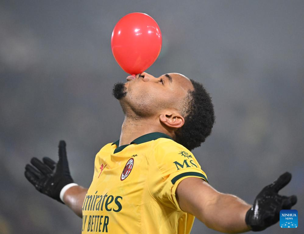 AC Milan's Christopher Nkunku celebrates his goal during a Serie A football match between Bologna and AC Milan in Bologna, Italy, Feb. 3, 2026. (Photo by Alberto Lingria/Xinhua)