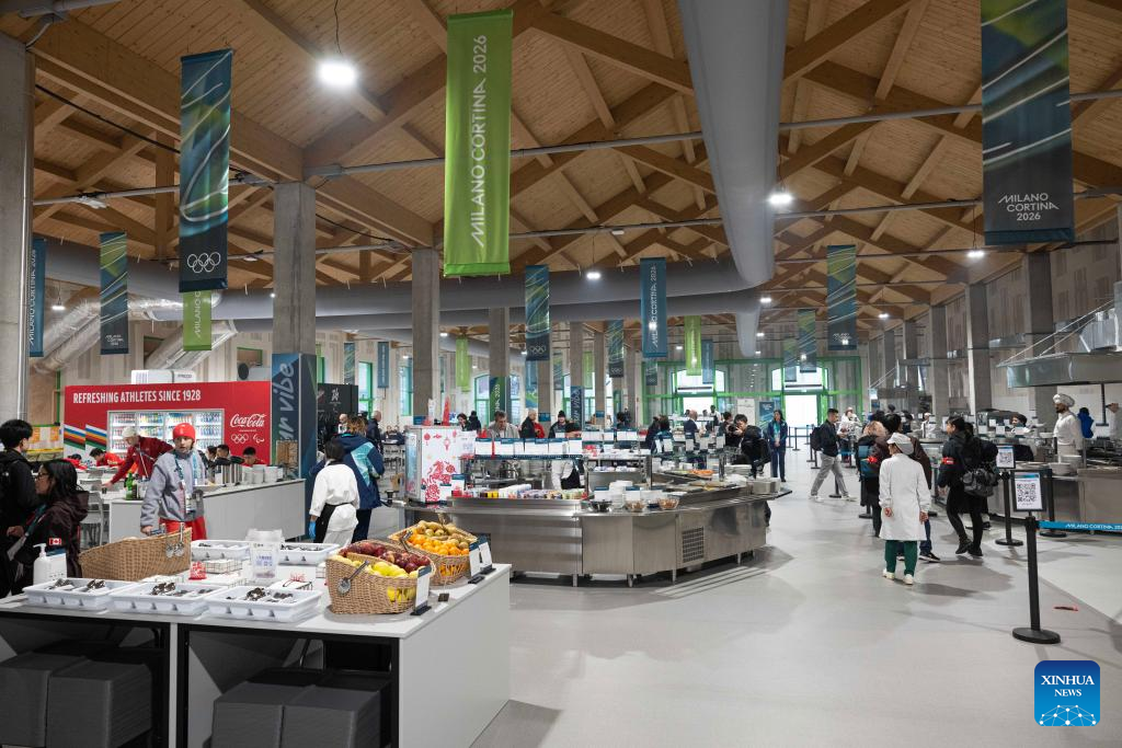 Photo taken on Feb. 3, 2026 shows the dining hall of the Olympic Village ahead of the 2026 Milan-Cortina Winter Olympics in Milan, Italy. (Xinhua/Zhang Haofu)