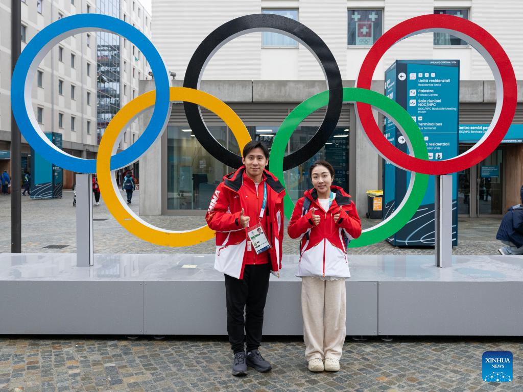 Chinese figure skating athletes Sui Wenjing (R) and Han Cong pose for photos in front of the Olympic rings at the Olympic Village ahead of the 2026 Milan-Cortina Winter Olympics in Milan, Italy, Feb. 3, 2026. (Xinhua/Zhang Haofu)