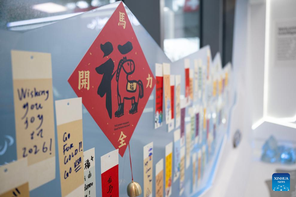 Photo taken on Feb. 3, 2026 shows the Chinese character "Fu" (meaning "Fortune") at the Olympic Village ahead of the 2026 Milan-Cortina Winter Olympics in Milan, Italy. (Xinhua/Zhang Haofu)
