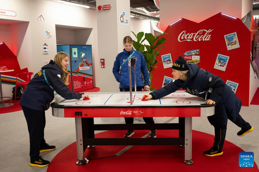Players of team Sweden play at the Olympic Village ahead of the 2026 Milan-Cortina Winter Olympics in Milan, Italy, Feb. 3, 2026. (Xinhua/Zhang Haofu)