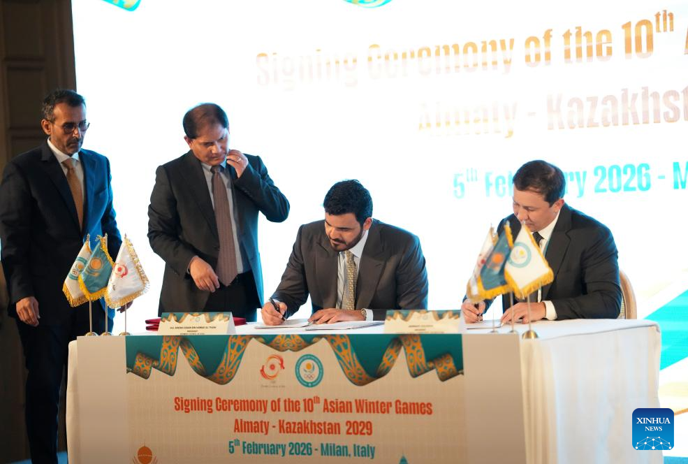 A host city contract signing ceremony of the 2029 Asian Winter Games is held in Milan, Italy, Feb. 5, 2026. The 2029 Asian Winter Games will be held in Almaty, Kazakhstan, the Olympic Council of Asia (OCA) announced on Monday. The event was originally scheduled to take place in Saudi Arabia. (Xinhua/Xue Yuge)