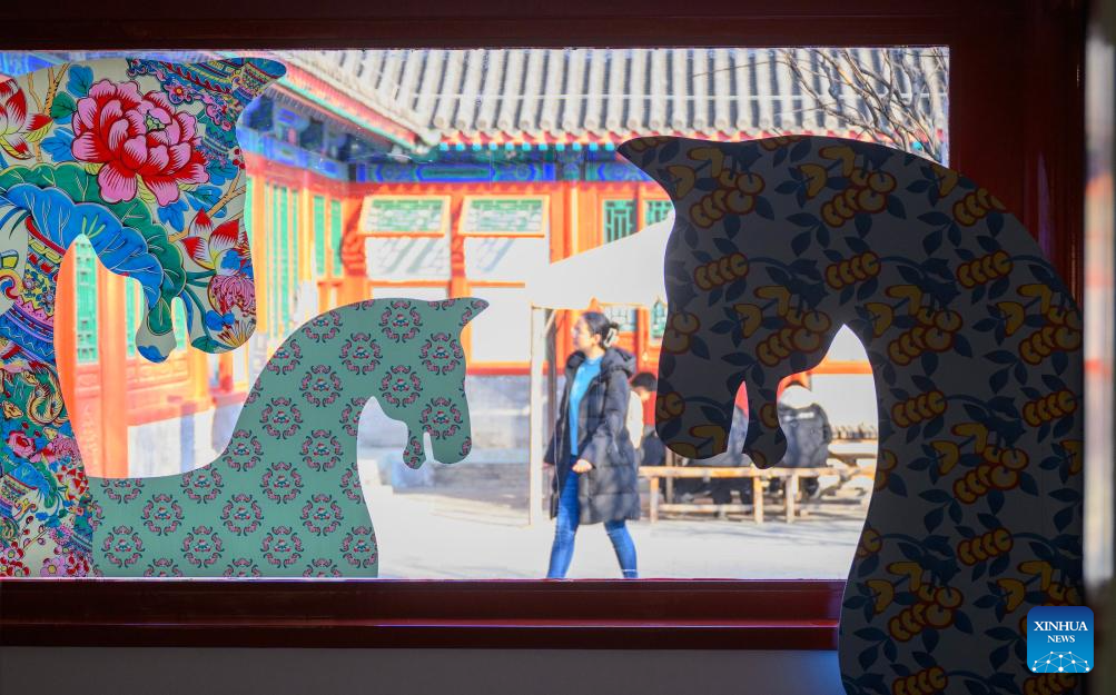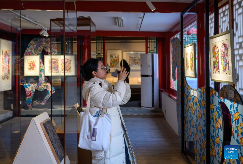A tourist visits a Chinese New Year paintings exhibition at the Prince Kung's Palace Museum in Beijing, capital of China, Feb. 4, 2026. An exhibition displaying more than a hundred exquisite Chinese New Year paintings collected by Prince Kung's Palace Museum opened here on Wednesday. (Xinhua/Jin Liangkuai)