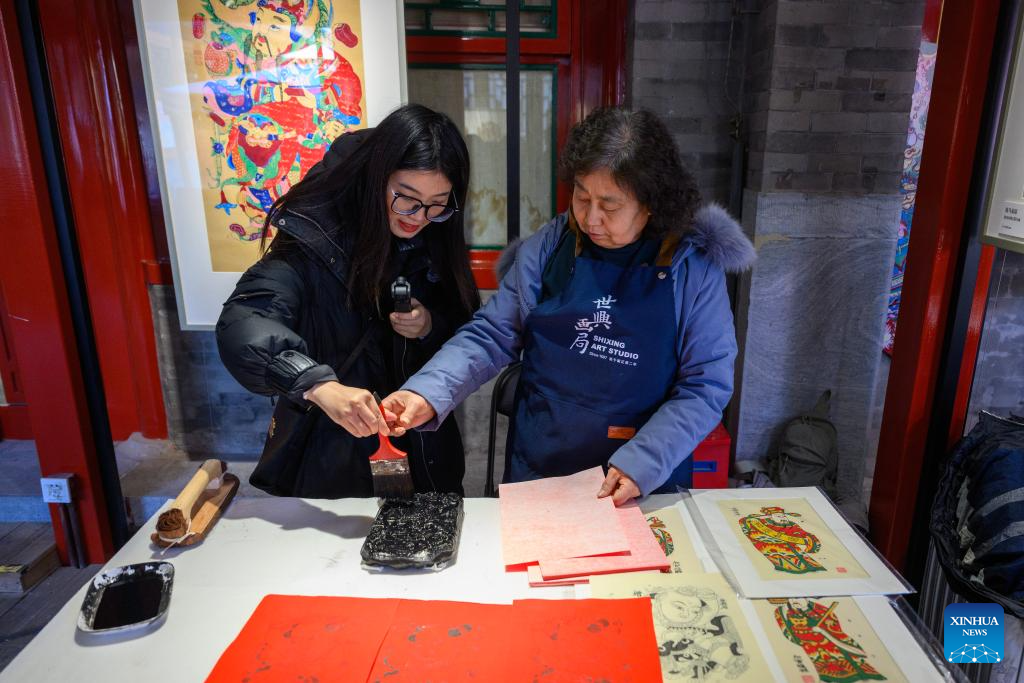 A tourist experiences the making of Chinese New Year paintings at Prince Kung's Palace Museum in Beijing, capital of China, Feb. 4, 2026. An exhibition displaying more than a hundred exquisite Chinese New Year paintings collected by Prince Kung's Palace Museum opened here on Wednesday. (Xinhua/Jin Liangkuai)