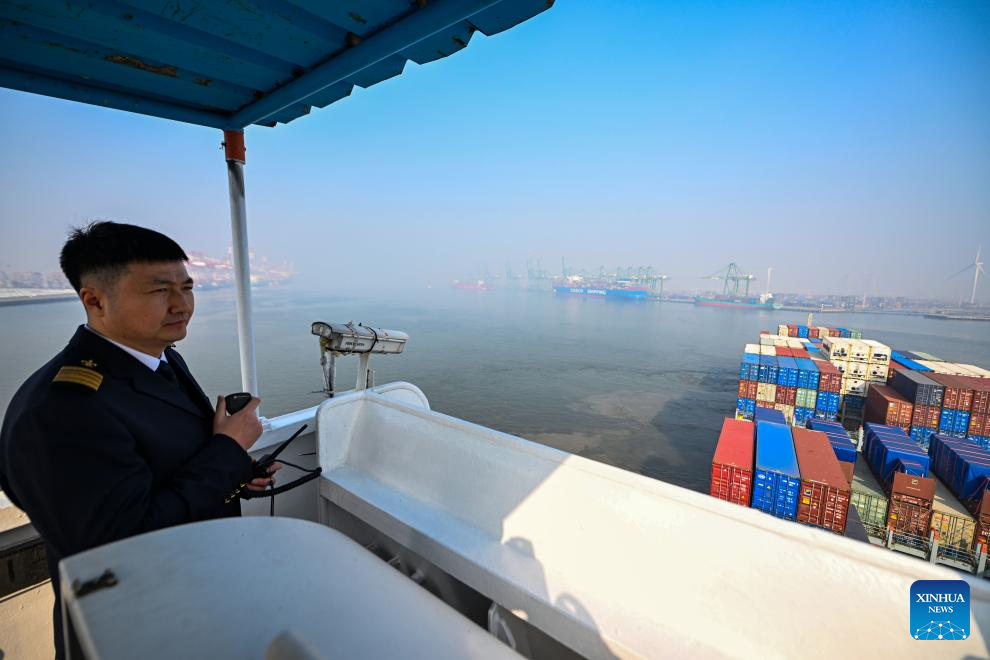 Sun Bo guides a cargo ferry to depart from Tianjin Port in Tianjin, north China, Feb. 4, 2026. (Xinhua/Zhao Zishuo)
