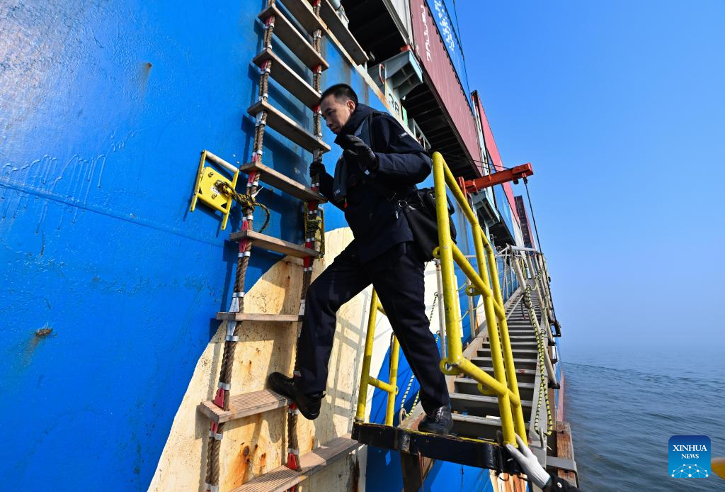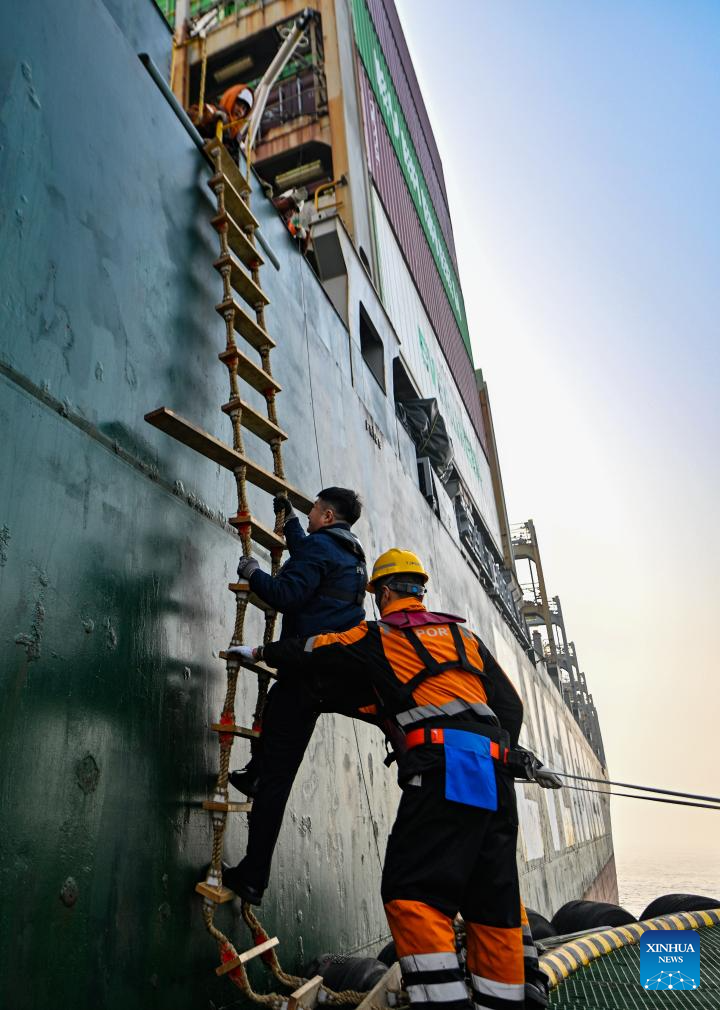 Sun Bo climbs up a soft ladder before conducting his piloting work at Tianjin Port in Tianjin, north China, Feb. 4, 2026. (Xinhua/Zhao Zishuo)