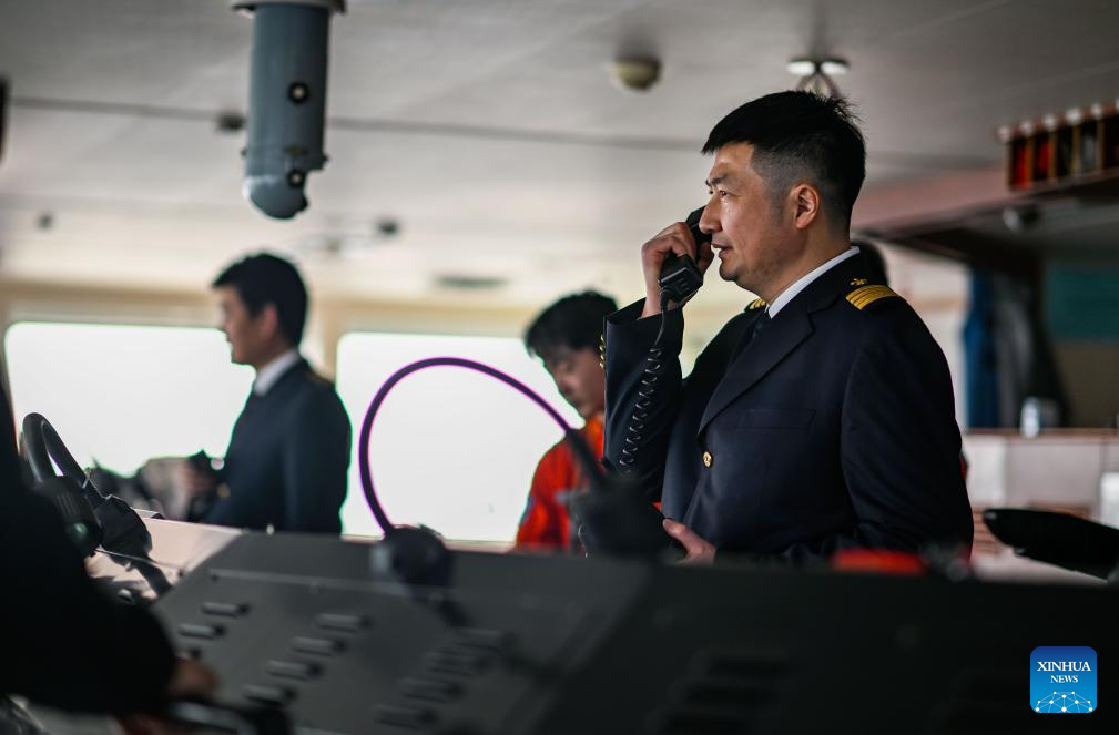Sun Bo communicates with the vessel traffic management center of the Tianjin Maritime Safety Administration on a cargo ferry at Tianjin Port in Tianjin, north China, Feb. 4, 2026.