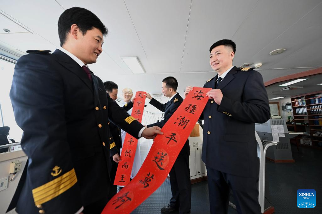 Sun Bo (R) presents a spring couplet to a captain on a cargo ferry at Tianjin Port in Tianjin, north China, Feb. 4, 2026. (Xinhua/Zhao Zishuo)