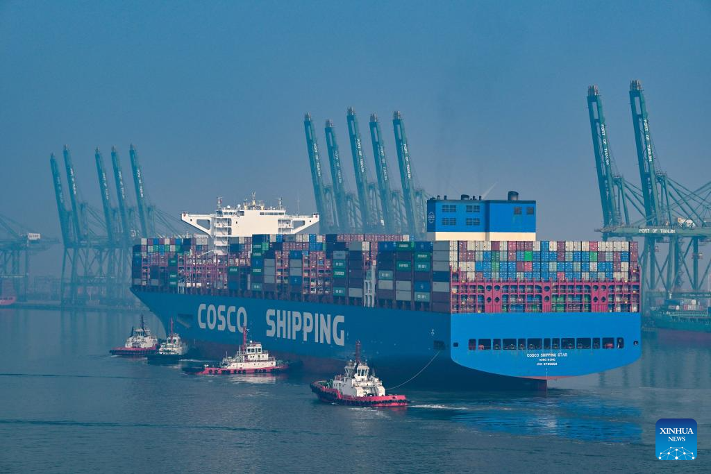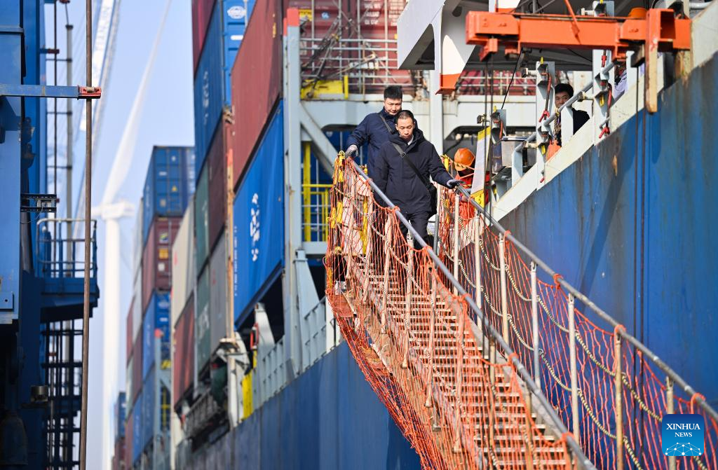 A cargo ship prepares to berth at the container dock of Tianjin Port in Tianjin, north China, Feb. 4, 2026. (Xinhua/Zhao Zishuo)