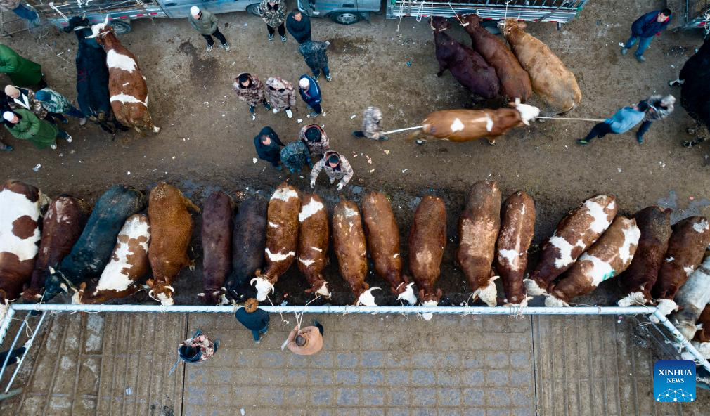 An aerial drone photo taken on Feb. 4, 2026 shows customers selecting cattle at Shanjiaji livestock trading market in Xiji County, northwest China's Ningxia Hui Autonomous Region. Wednesday marks "Lichun," or the Beginning of Spring, the first of the 24 solar terms on the Chinese lunisolar calendar. It's also a trading day for Shanjiaji livestock trading market.