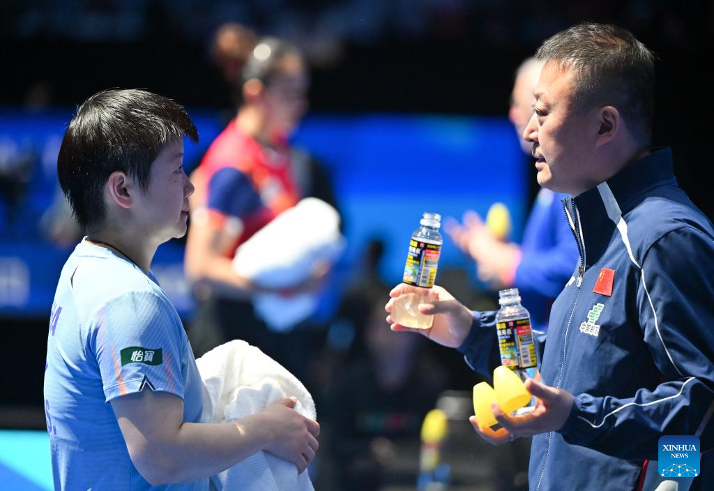 Sun Yingsha of China (L) communicates with her coach Ma Lin during the women's singles group match between Sun Yingsha of China and Manika Batra of India at the ITTF-ATTU Asian Cup Haikou 2026 table tennis tournament in Haikou, south China's Hainan Province, Feb. 5, 2026. (Xinhua/Guo Cheng)