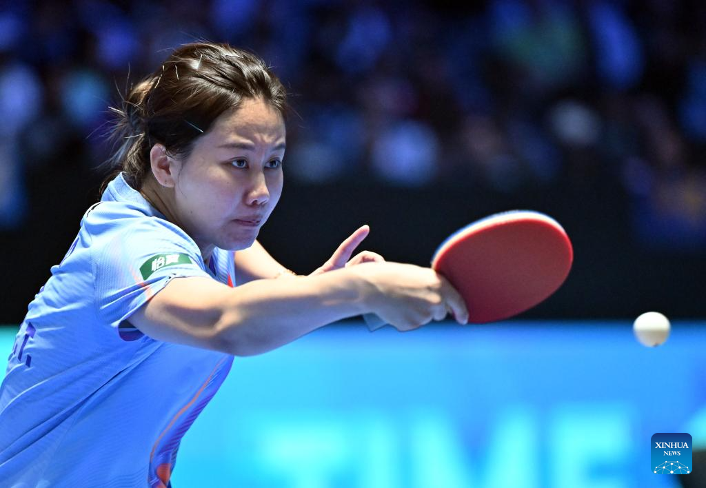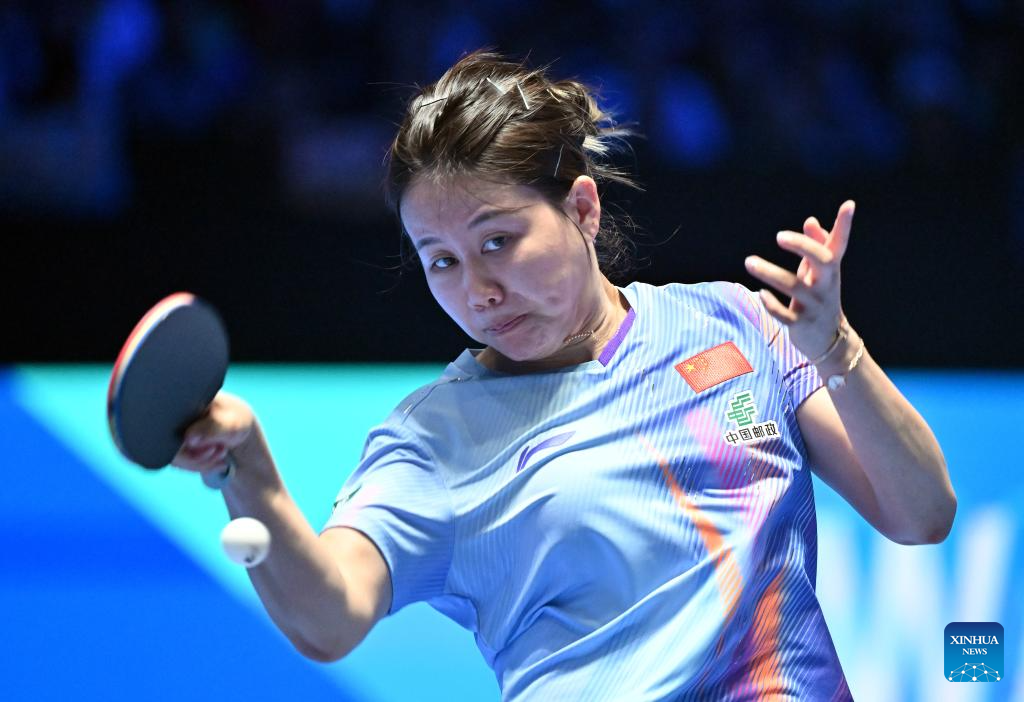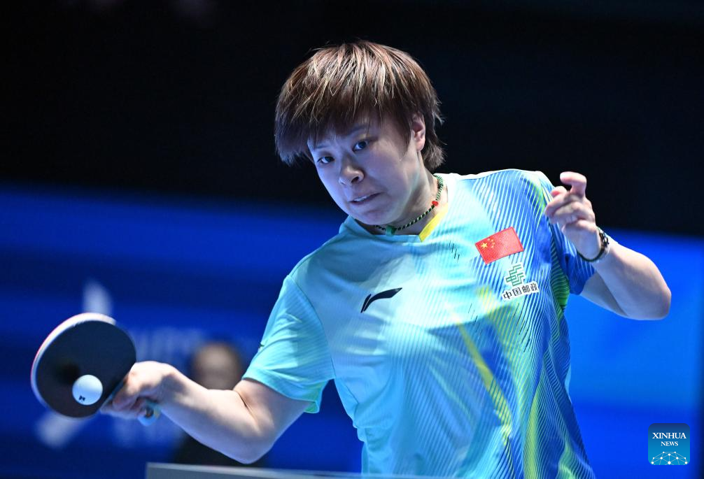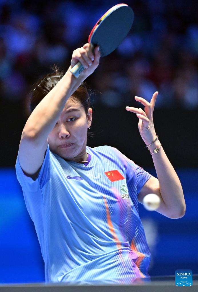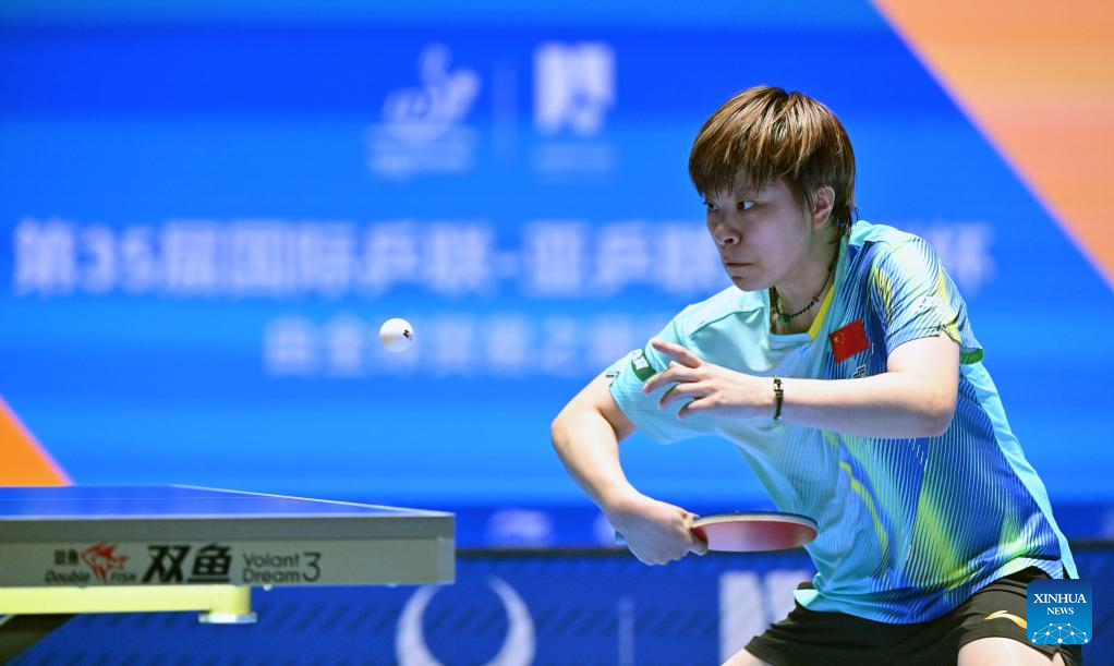 Wang Manyu hits a return during the women's singles group match between Wang Manyu of China and Akae Kaho of Japan at the ITTF-ATTU Asian Cup Haikou 2026 table tennis tournament in Haikou, south China's Hainan Province, Feb. 5, 2026. (Xinhua/Guo Cheng)