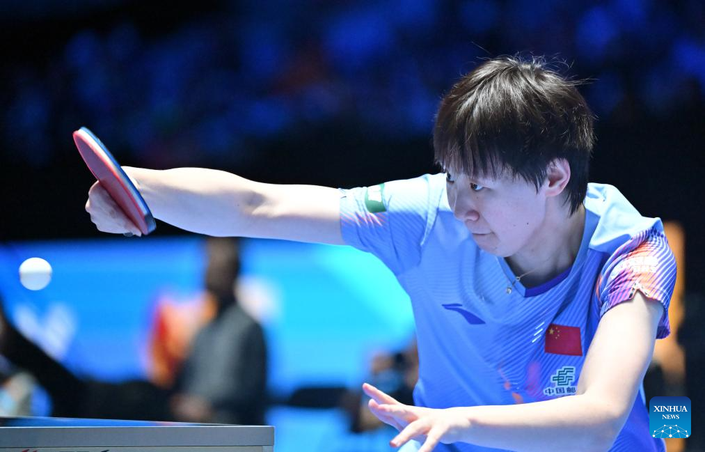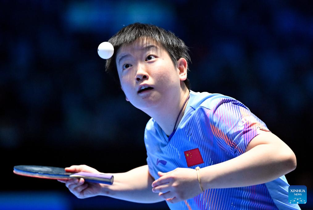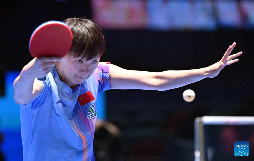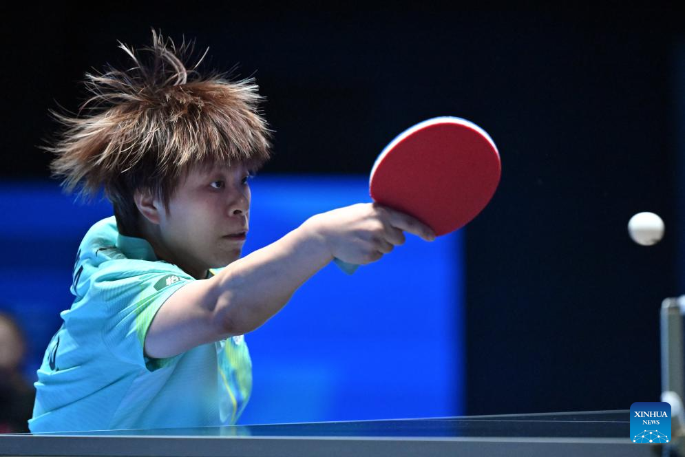 Chen Xingtong hits a return during the women's singles group match between Chen Xingtong of China and Doo Hoi Kem of China's Hong Kong at the ITTF-ATTU Asian Cup Haikou 2026 table tennis tournament in Haikou, south China's Hainan Province, Feb. 5, 2026. (Xinhua/Guo Cheng)