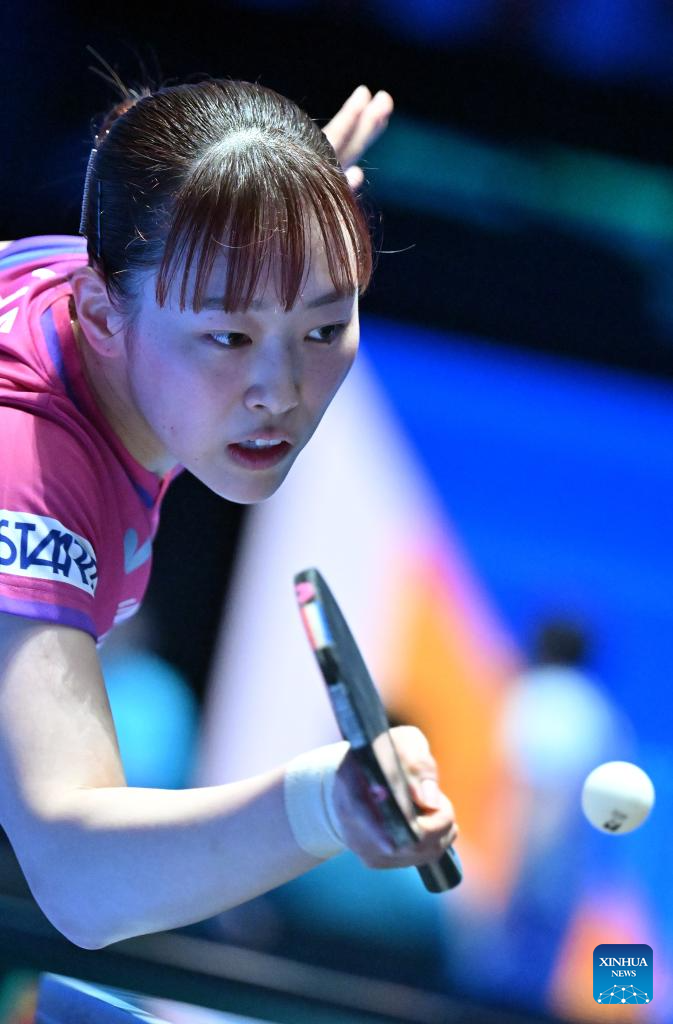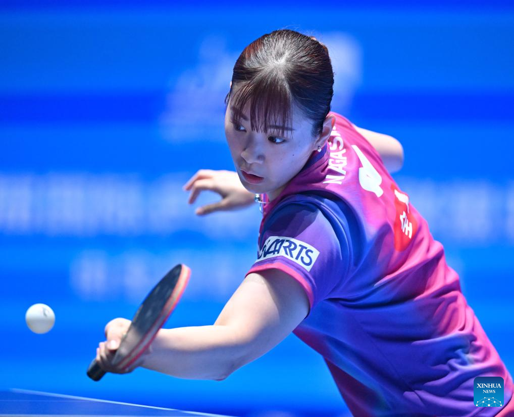 Nagasaki Miyu hits a return during the women's singles group match between Wang Yidi of China and Nagasaki Miyu of Japan at the ITTF-ATTU Asian Cup Haikou 2026 table tennis tournament in Haikou, south China's Hainan Province, Feb. 5, 2026. (Xinhua/Guo Cheng)