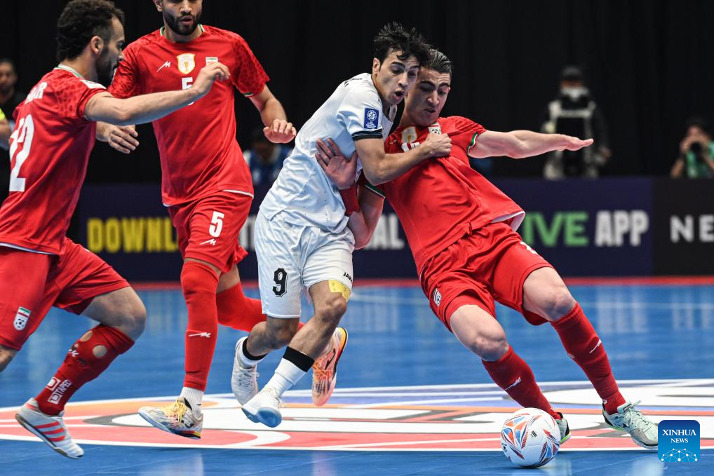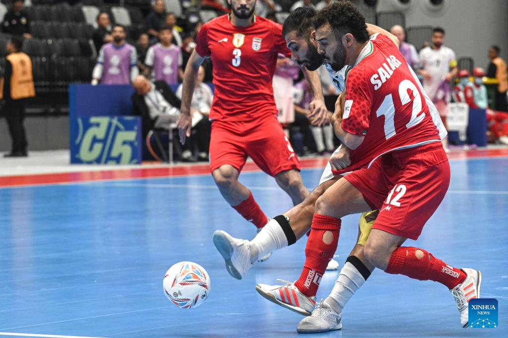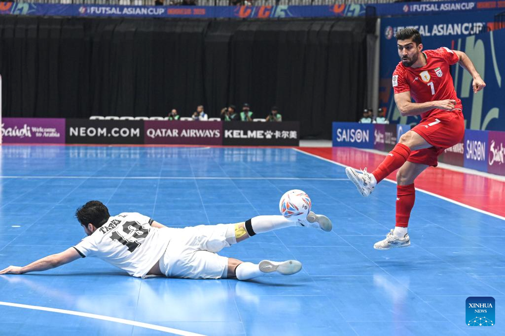 Salar Aghapour (R) of Iran competes during the semifinal match between Iraq and Iran at the AFC Futsal Asian Cup 2026 in Jakarta, Indonesia, Feb. 5, 2026. (Xinhua/Agung Kuncahya B.)