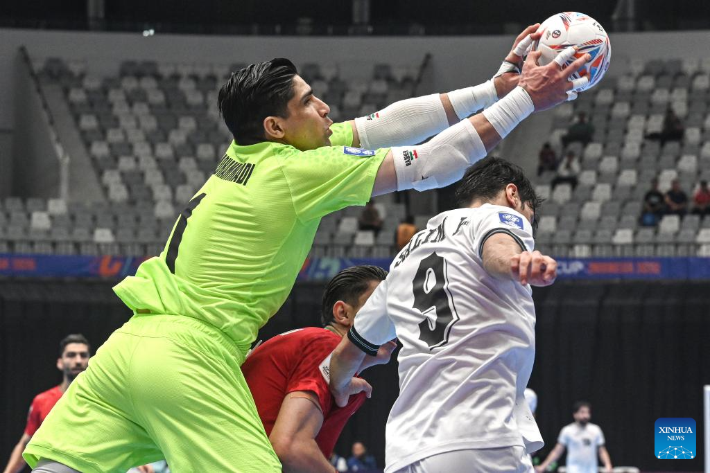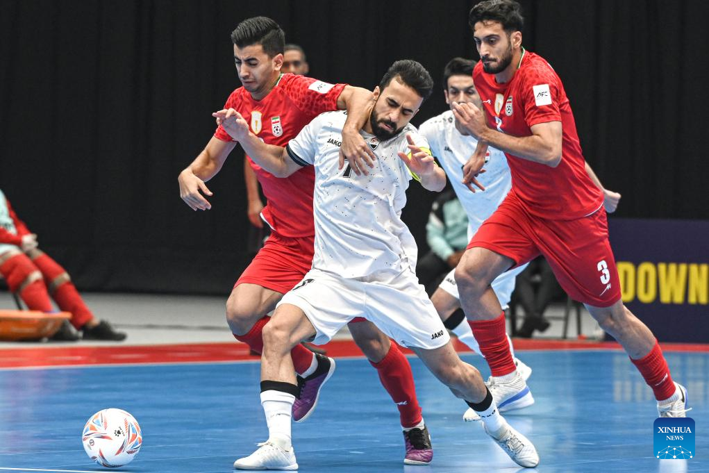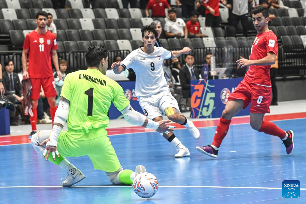 Salim Faisal Al-Husaynat (C) of Iraq competes during the semifinal match between Iraq and Iran at the AFC Futsal Asian Cup 2026 in Jakarta, Indonesia, Feb. 5, 2026. (Xinhua/Agung Kuncahya B.)