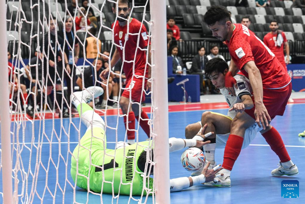 Bagher Mohammadi (2nd L), goalkeeper of Iran, fails to save the goal from Salim Kadhim Al-Darraji (2nd R) of Iraq during the semifinal match between Iraq and Iran at the AFC Futsal Asian Cup 2026 in Jakarta, Indonesia, Feb. 5, 2026. (Xinhua/Agung Kuncahya B.)