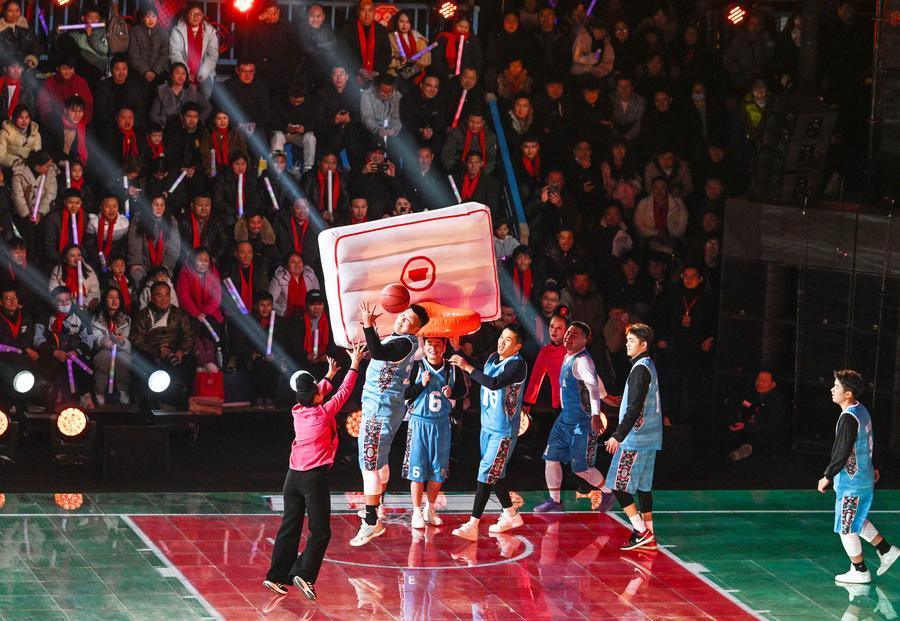 TAIJIANG, Feb. 5 (Xinhua) -- A "village gala" was held at the court of the "Village Basketball Association (Village BA)" in Taijiang County Tuesday night, which featured various folk performances staged by local villagers. "Village Basketball Association" or "Village BA", is a grassroot basketball tournament held in Taipan Village. Organized by local residents, this event has gained popularity over the years and draws a large crowd of spectators and participants alike.