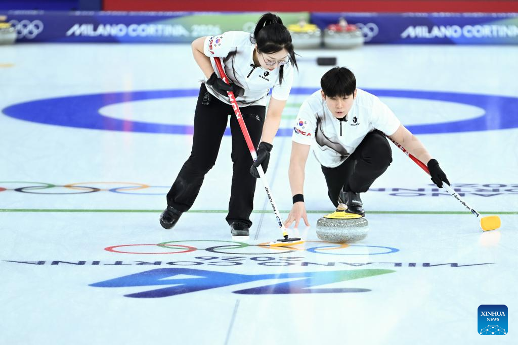 Kim Seonyeong and Jeong Yeongseok (R) of South Korea compete during the curling mixed doubles round robin session 4 match between South Korea and Switzerland of the 2026 Milan-Cortina Winter Olympics in Cortina D'Ampezzo, Italy, Feb. 5, 2026. (Xinhua/Lian Yi)