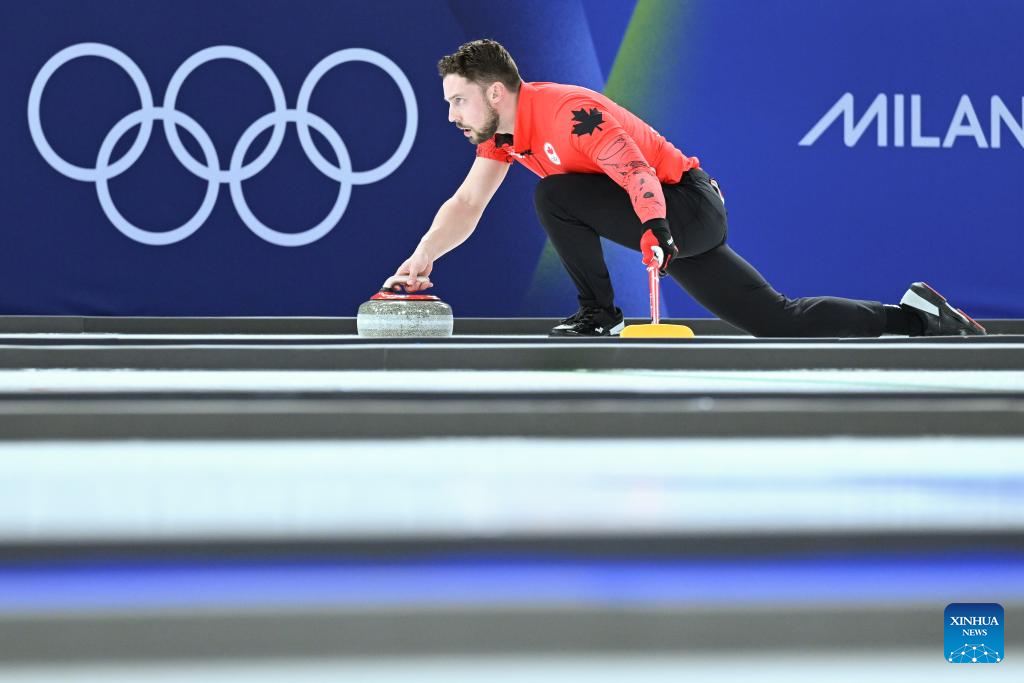 Brett Gallant of Canada competes during the curling mixed doubles round robin session 4 match between Canada and Italy of the 2026 Milan-Cortina Winter Olympics in Cortina D'Ampezzo, Italy, Feb. 5, 2026. (Xinhua/Lian Yi)