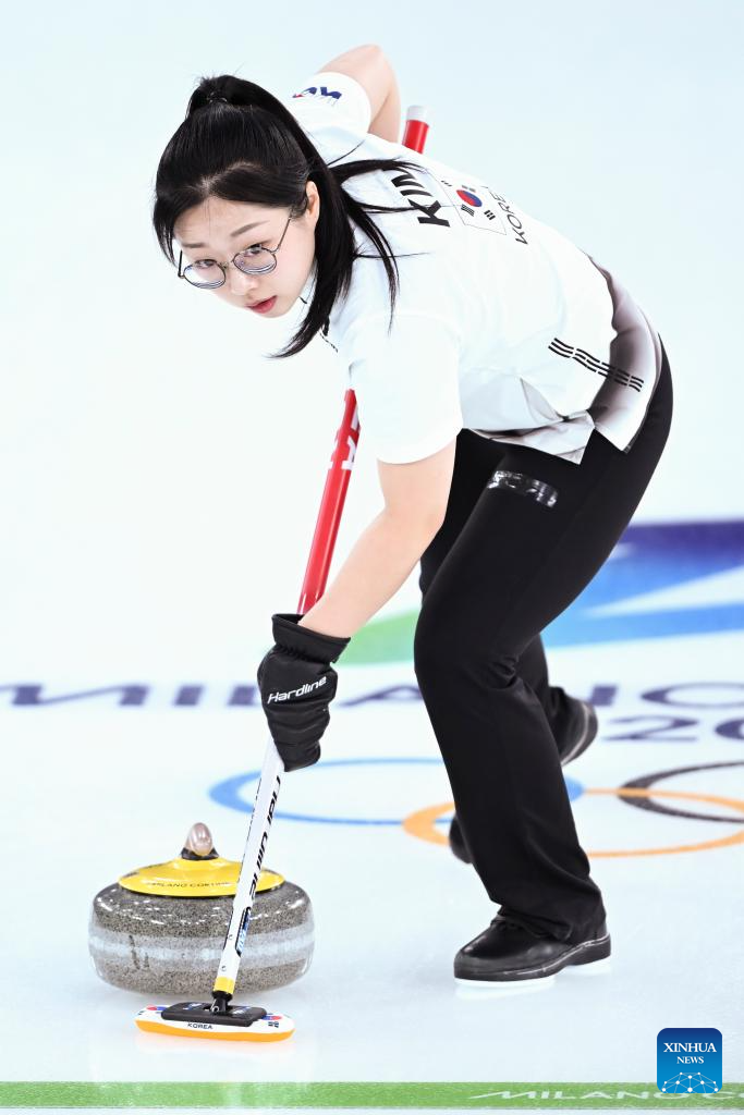 Kim Seonyeong of South Korea competes during the curling mixed doubles round robin session 4 match between South Korea and Switzerland of the 2026 Milan-Cortina Winter Olympics in Cortina D'Ampezzo, Italy, Feb. 5, 2026. (Xinhua/Lian Yi)