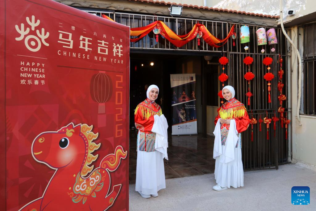 Jordanian youths dressed in traditional Chinese opera costumes stand at the entrance of the theatre for "Happy Chinese New Year" in Jordan celebrations at the Jordan National Center for Culture and Arts in Amman, Jordan, on Feb. 5, 2026. The 2026 "Happy Chinese New Year" in Jordan celebrations for the Year of the Horse launched on Thursday at the Jordan National Center for Culture and Arts. (Photo by Mohammad Abu Ghosh/Xinhua)
