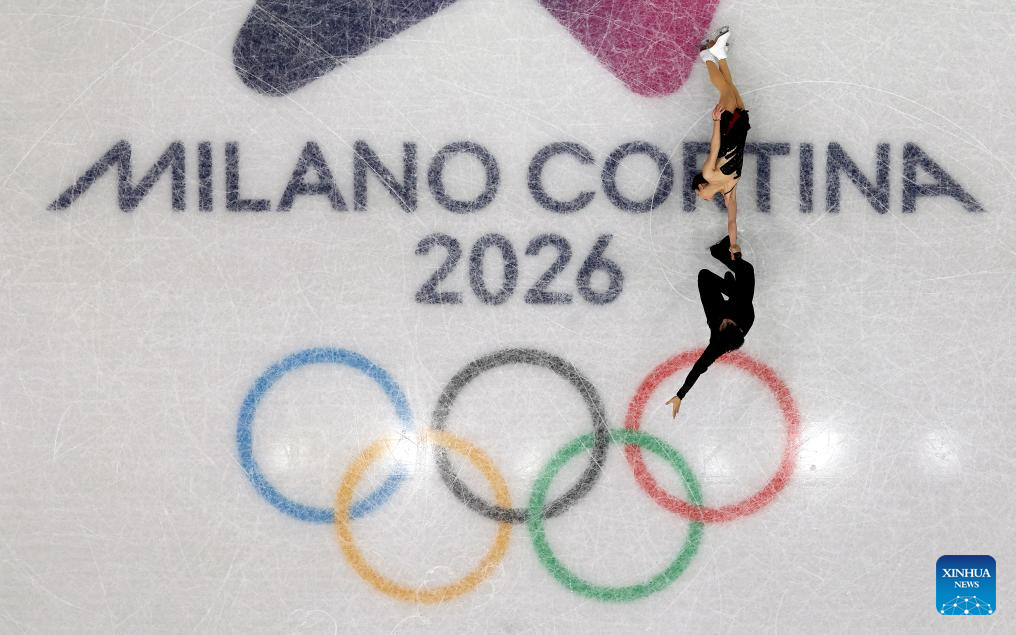 Sui Wenjing (up) and Han Cong of China perform during the figure skating team event pair skating short program of the Milan-Cortina 2026 Olympic Winter Games in Milan, Italy, Feb. 6, 2026. (Xinhua/Cheng Min)