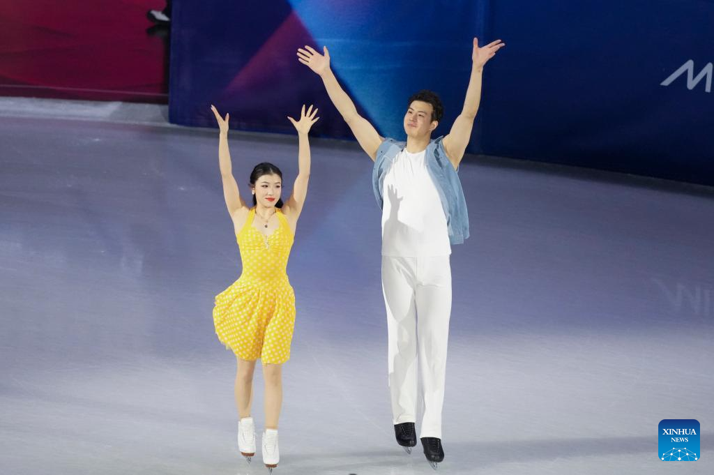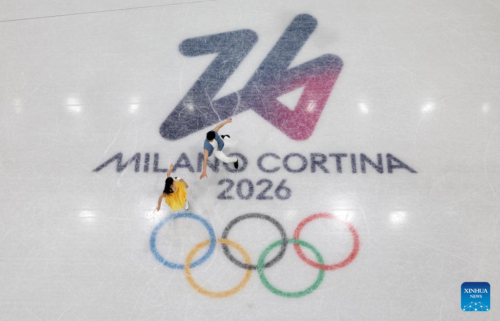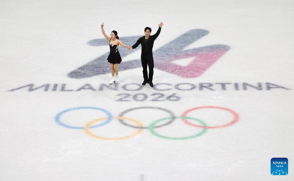 Wang Shiyue (L)/Liu Xinyu of China greet spectators before the figure skating team event ice dance rhythm dance of the Milan-Cortina 2026 Olympic Winter Games in Milan, Italy, Feb. 6, 2026. (Xinhua/Xue Yuge)