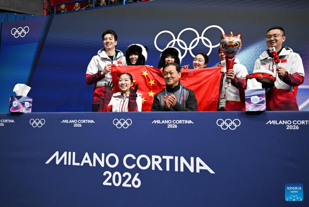Sui Wenjing (L) and Han Cong of China greet spectators after performing during the figure skating team event pair skating short program of the Milan-Cortina 2026 Olympic Winter Games in Milan, Italy, Feb. 6, 2026. (Xinhua/Chen Yichen)