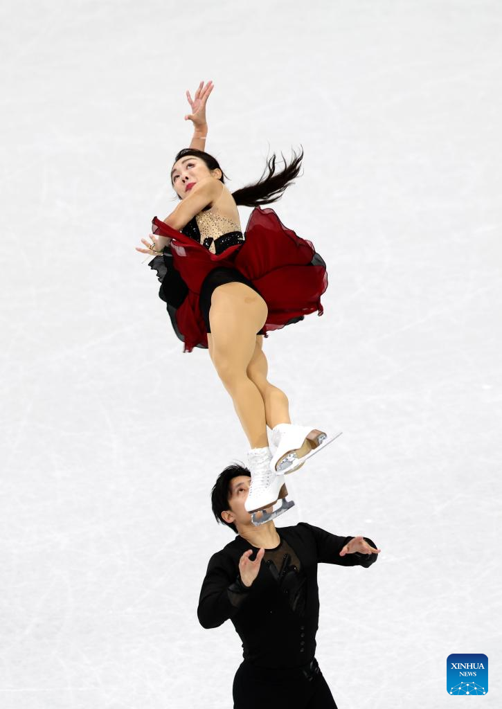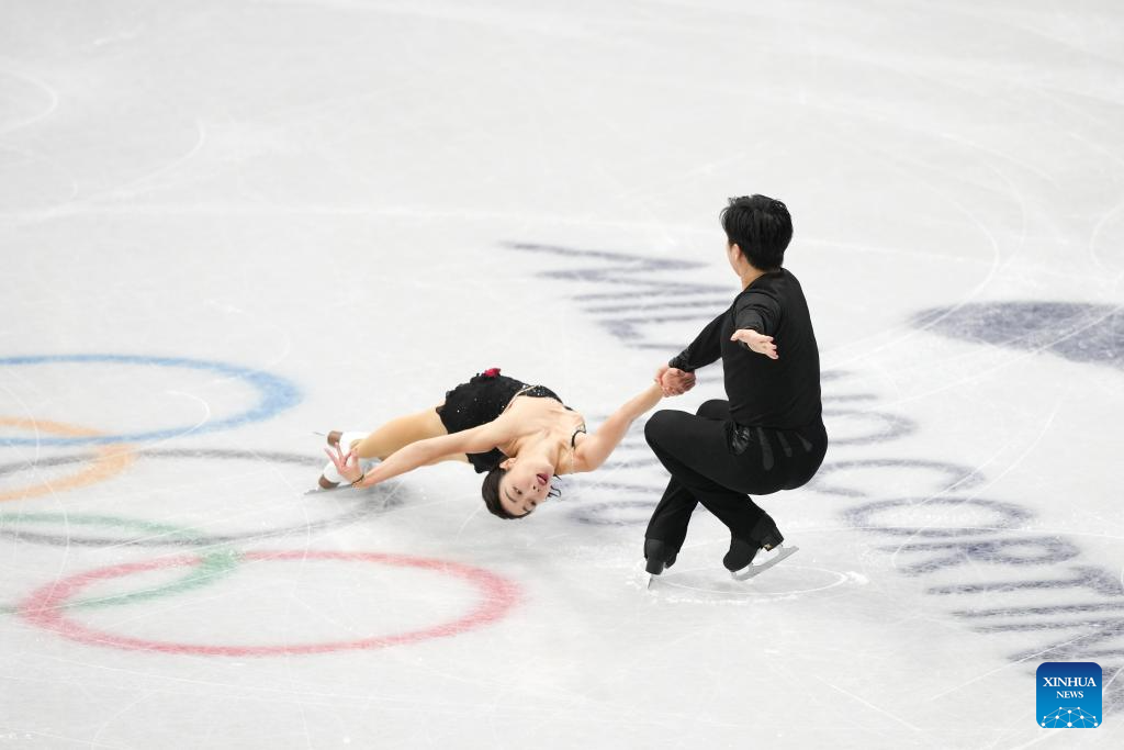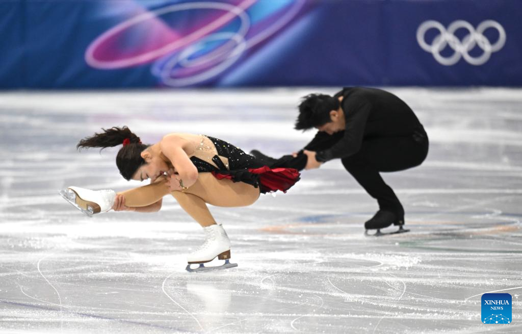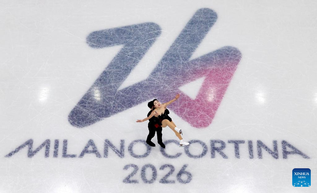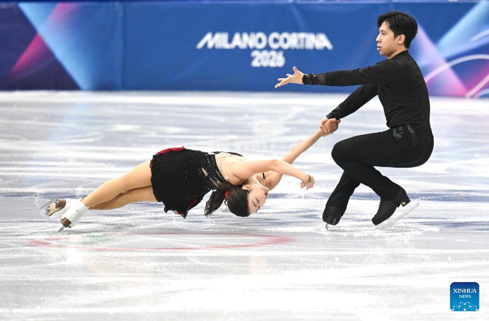 Sui Wenjing (up) and Han Cong of China perform during the figure skating team event pair skating short program of the Milan-Cortina 2026 Olympic Winter Games in Milan, Italy, Feb. 6, 2026. (Xinhua/Li Ming)
