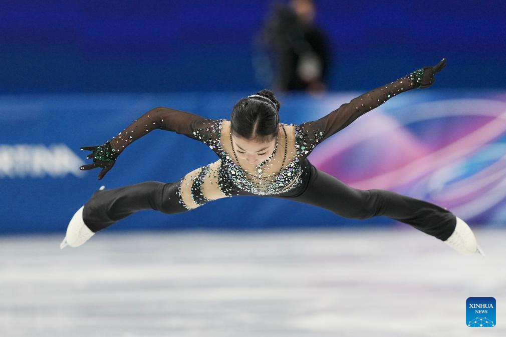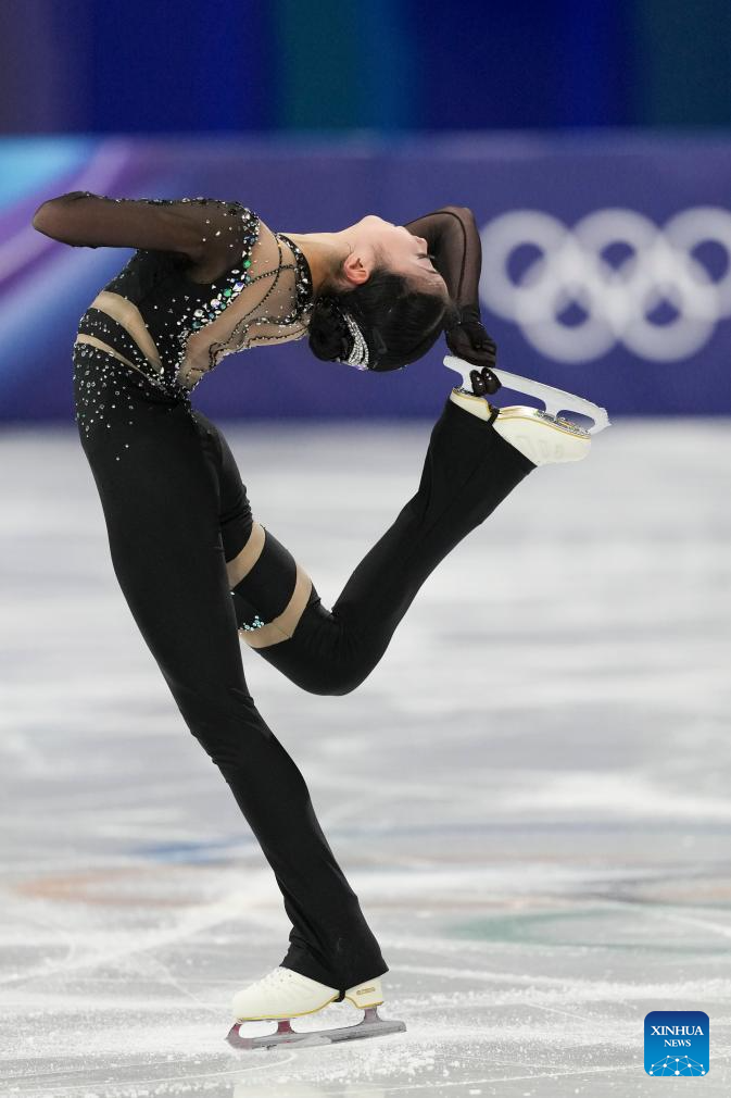 Zhang Ruiyang of China performs during the women single skating short program of the figure skating team event of the Milan-Cortina 2026 Olympic Winter Games in Milan, Italy, Feb. 6, 2026. (Xinhua/Cheng Min)