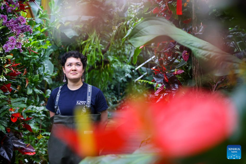 A member of staff puts the finishing touches to floral displays of orchids ahead of the Orchid Festival at Kew Gardens in London, Britain, Feb. 5, 2026. The festival will open to the public from Feb. 7 to March 8. (Xinhua)