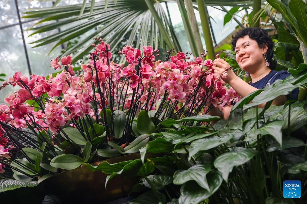 A member of staff puts the finishing touches to floral displays of orchids ahead of the Orchid Festival at Kew Gardens in London, Britain, Feb. 5, 2026. (Xinhua)