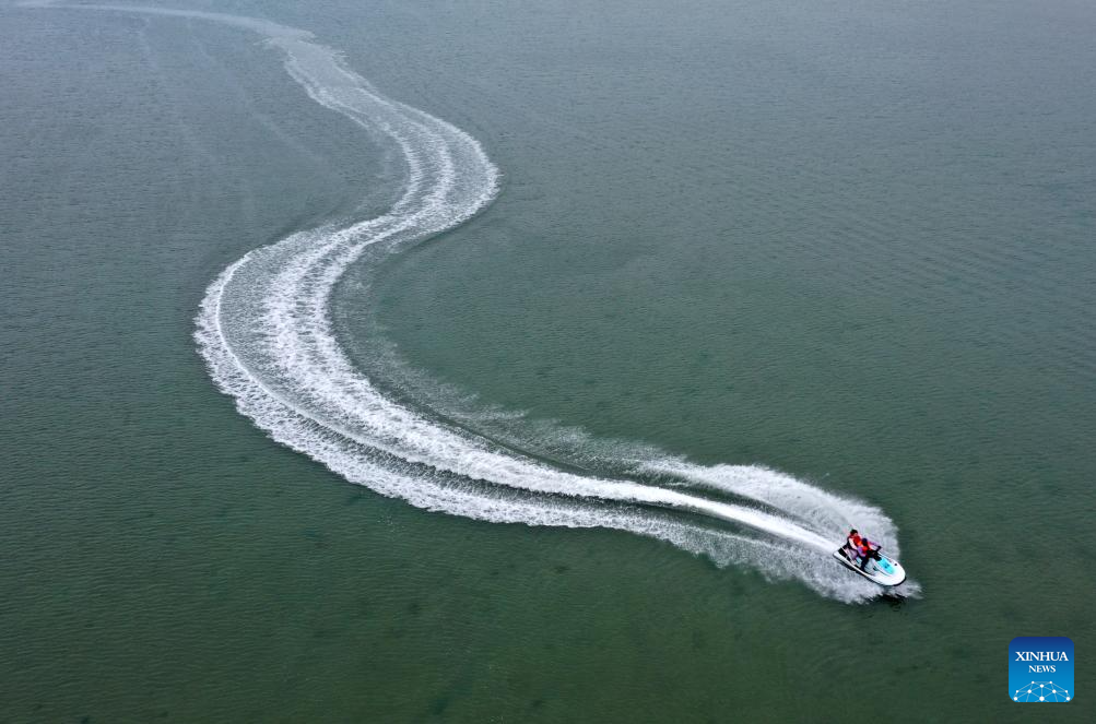 An aerial drone photo taken on Feb. 5, 2026 shows tourists enjoying water activities in the sea near Beihai City, south China's Guangxi Zhuang Autonomous Region. (Xinhua/Lu Boan)