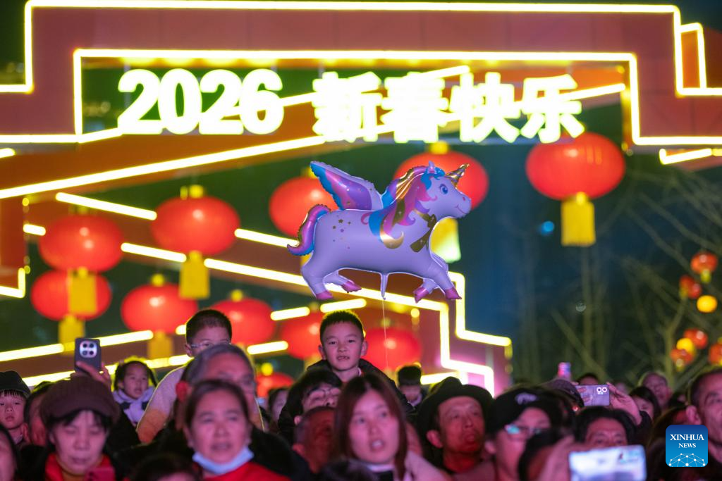 People watch performances at the opening ceremony of a fair featuring Chinese New Year goods in southwest China's Chongqing Municipality, Feb. 5, 2026. A fair featuring Chinese New Year goods kicked off here on Thursday, offering residents a one-stop destination for New Year shopping with diverse choices. (Xinhua/Chen Cheng)