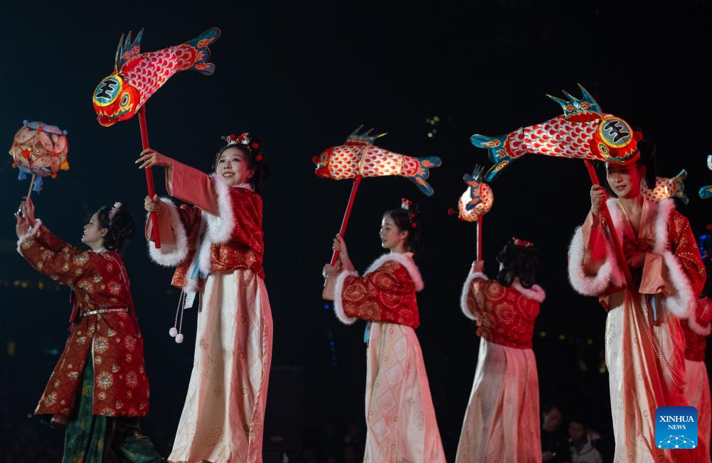 People perform at the opening ceremony of a fair featuring Chinese New Year goods in southwest China's Chongqing Municipality, Feb. 5, 2026. A fair featuring Chinese New Year goods kicked off here on Thursday, offering residents a one-stop destination for New Year shopping with diverse choices. (Xinhua/Chen Cheng)