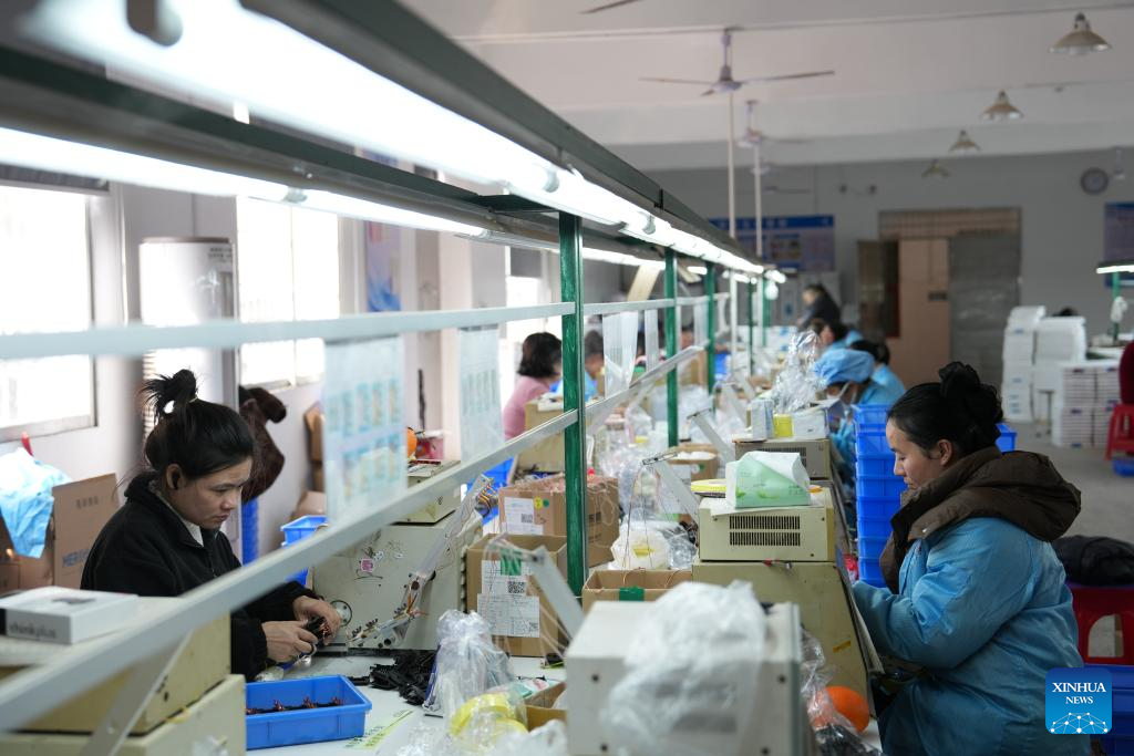 Local residents work at an electronics factory at a resettlement site in Bamianshan Yao Township, Zixing City, central China's Hunan Province, Feb. 5, 2026. In July 2024, rainstorms unleashed by Typhoon Gaemi hit Zixing City, affecting about 128,000 people and damaging 23,000 houses.