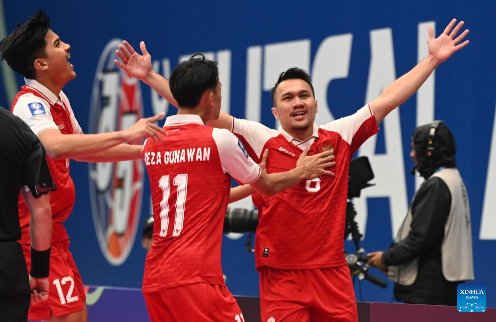 Samuel Eko (R) of Indonesia celebrates his goal during the semifinal match between Indonesia and Japan at the AFC Futsal Asian Cup 2026 in Jakarta, Indonesia, Feb. 5, 2026. (Xinhua/Zulkarnain)