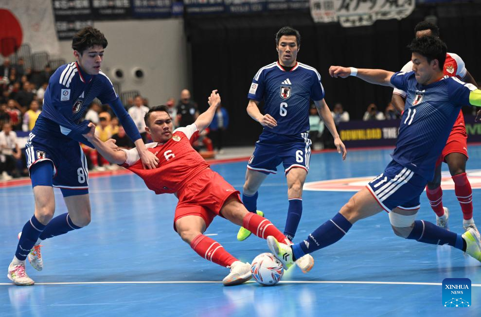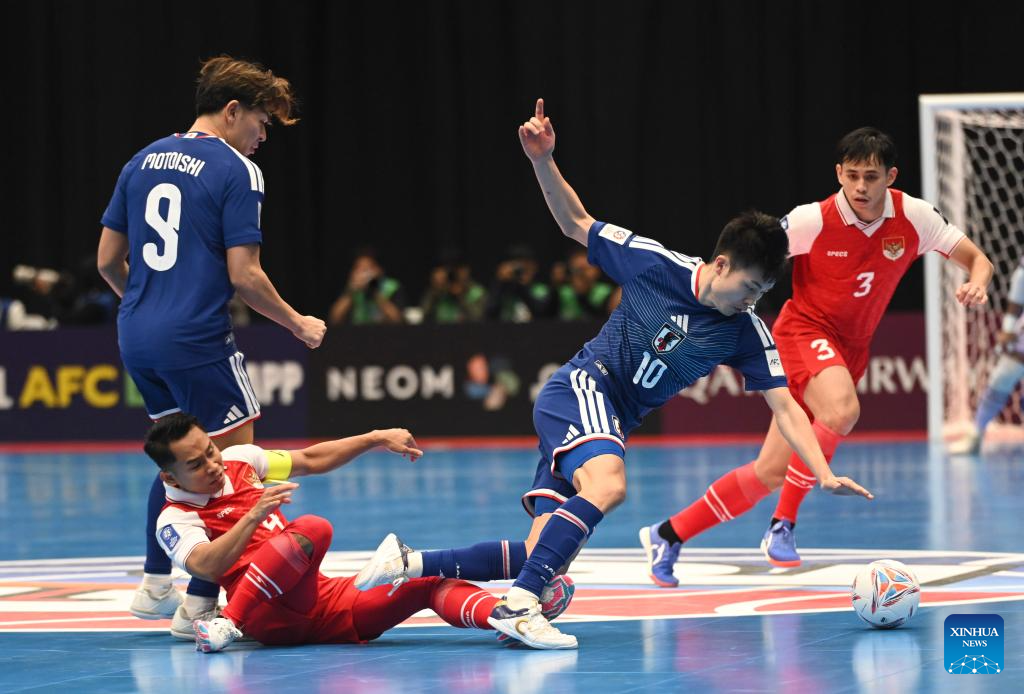 Samuel Eko (2nd L) of Indonesia vies with Shimizu Kazuya (1st R) of Japan during the semifinal match between Indonesia and Japan at the AFC Futsal Asian Cup 2026 in Jakarta, Indonesia, Feb. 5, 2026. (Xinhua/Zulkarnain)