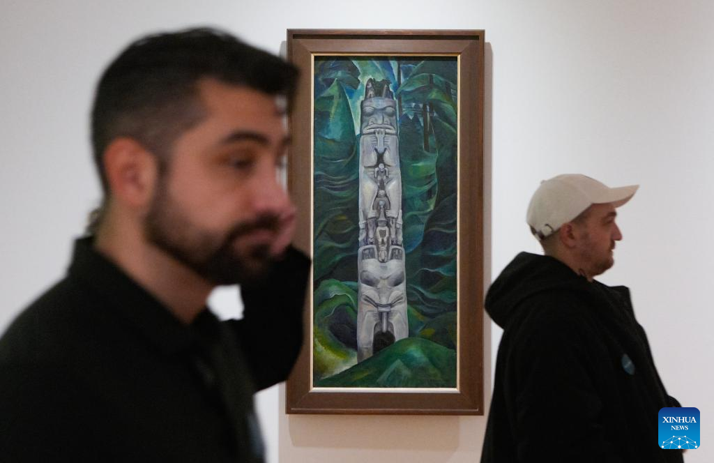 People walk past a painting at a preview of the exhibition "That Green Ideal: Emily Carr and the Idea of Nature" at the Vancouver Art Gallery in Vancouver, British Columbia, Canada, on Feb. 5, 2026. (Photo by Liang Sen/Xinhua)