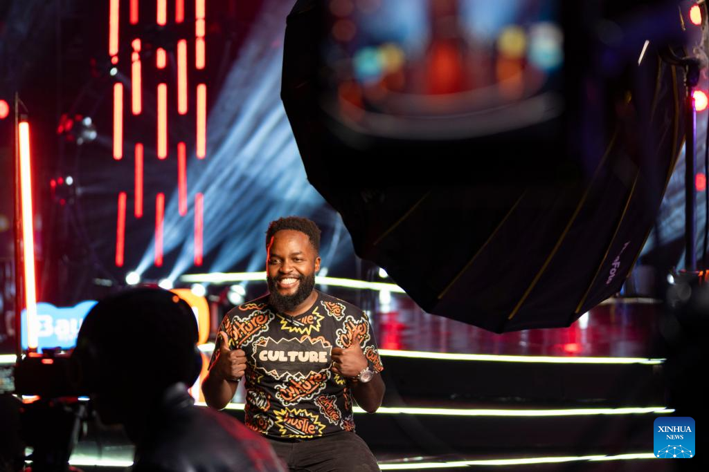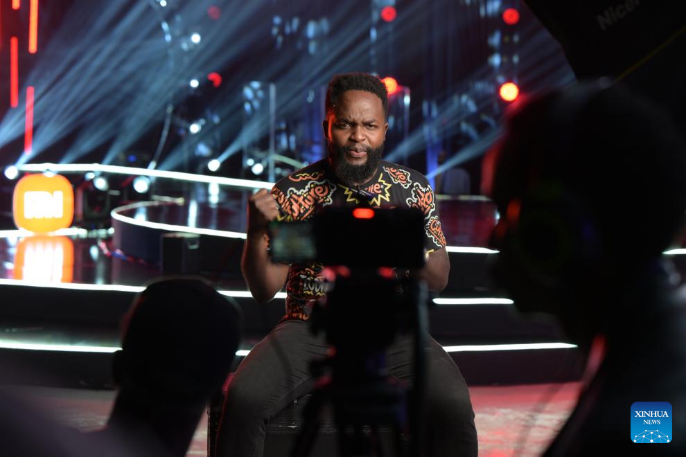 Fanuel Mulwa receives an interview during the finals of Sing for Africa, a Chinese-supported musical talent show in Nairobi, Kenya, Dec. 29, 2025. (Xinhua/Yang Guang)