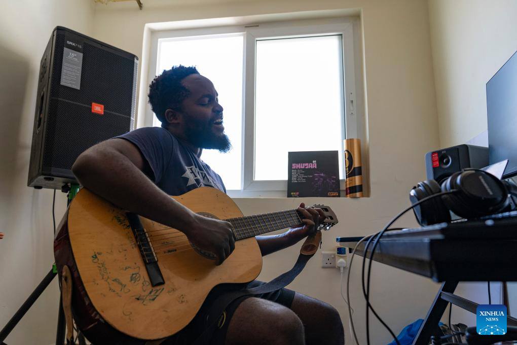Fanuel Mulwa plays the guitar at home in Kajiado County, Kenya, Jan. 16, 2026. (Xinhua/Xie Jianfei)