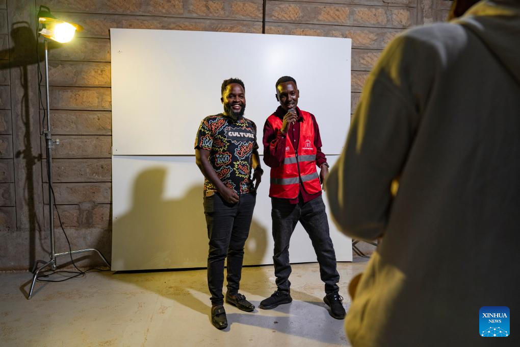 Fanuel Mulwa (L) receives an interview during the finals of Sing for Africa, a Chinese-supported musical talent show in Nairobi, Kenya, Dec. 29, 2025. (Xinhua/Xie Jianfei)