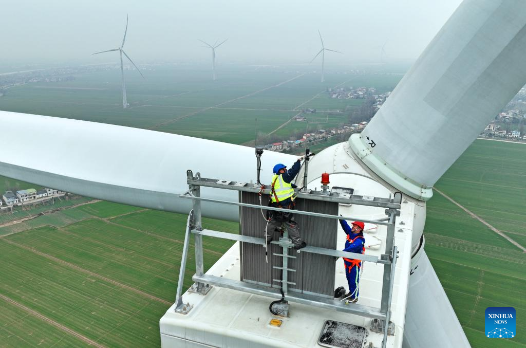 This drone photo shows workers conducting maintenance and inspection on wind turbines on Mianchuan Island of Jiujiang City, east China's Jiangxi Province, Jan. 29, 2026. Mianchuan Island, located in the Jiangxi section of the Yangtze River and surrounded by water, covers an area of 104 square kilometers. It can be reached by a ten-minute ferry ride from Madang Ferry Terminal in Jiujiang City. (Xinhua/Wan Xiang)