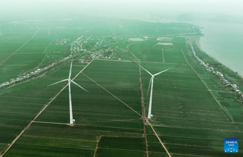This drone photo shows the wind turbines on Mianchuan Island of Jiujiang City, east China's Jiangxi Province, Jan. 29, 2026. Mianchuan Island, located in the Jiangxi section of the Yangtze River and surrounded by water, covers an area of 104 square kilometers. It can be reached by a ten-minute ferry ride from Madang Ferry Terminal in Jiujiang City. (Xinhua/Wan Xiang)