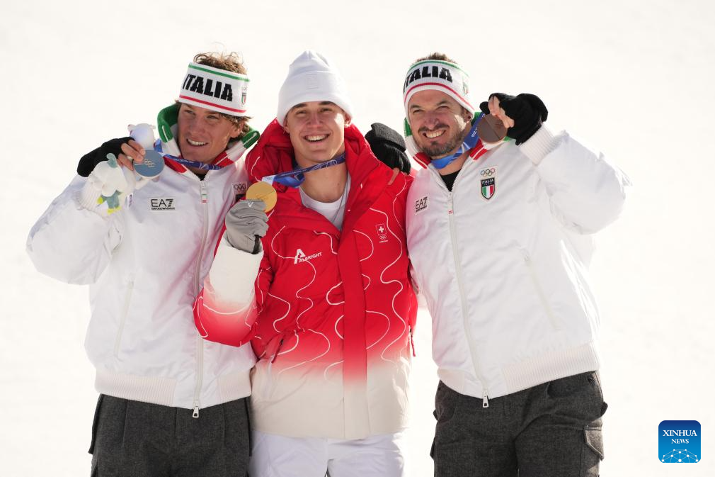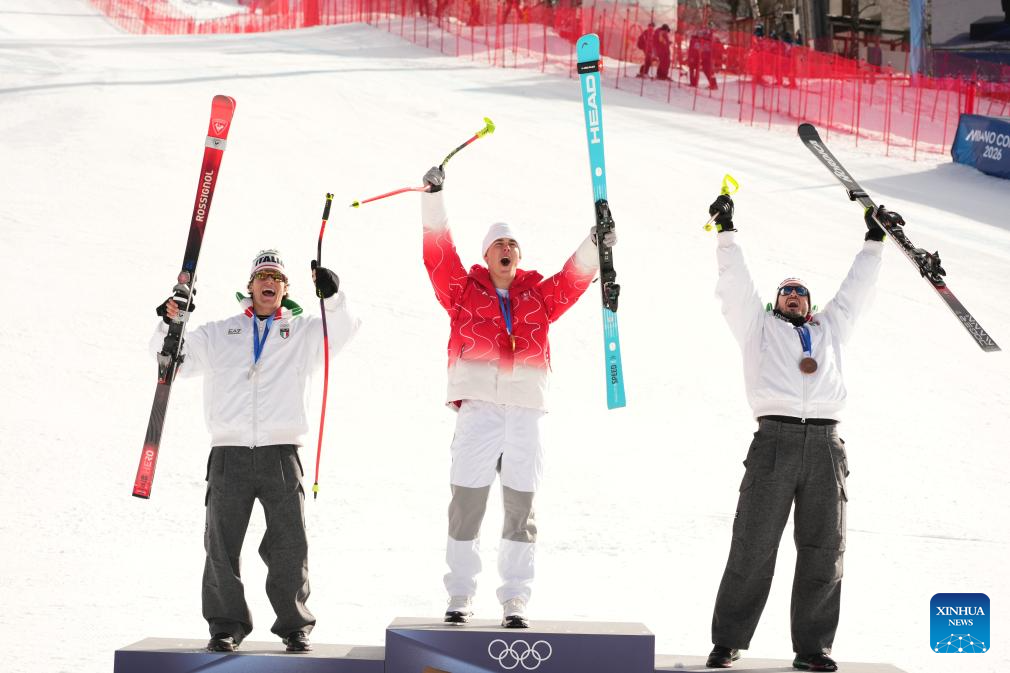Gold medalist Franjo von Allmen (C) of Switzerland, silver medalist Giovanni Franzoni (L) of Italy and bronze medalist Dominik Paris of Italy pose for photos during the awarding ceremony for the alpine skiing men's downhill of the Milan-Cortina 2026 Olympic Winter Games in Bormio, Italy, Feb. 7, 2026. (Xinhua/Yan Linyun)